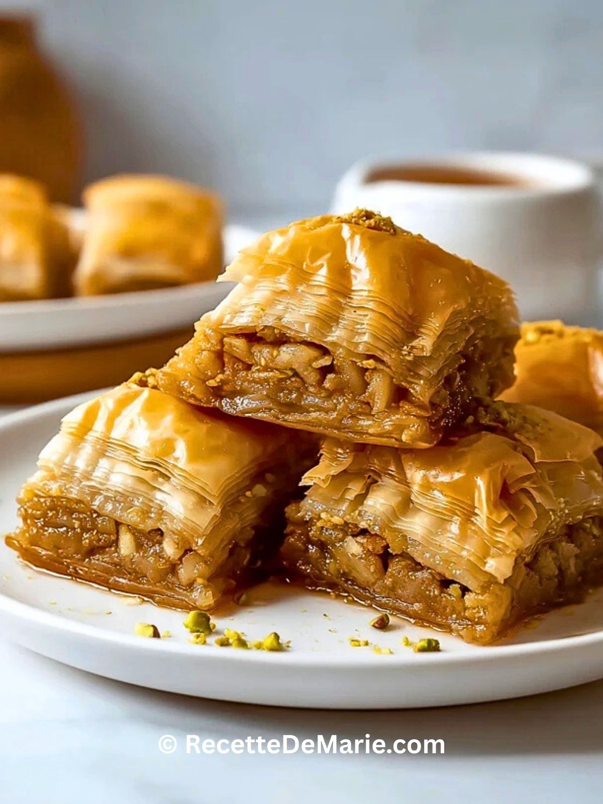 Baklava aux pommes croustillant et fondant, une délicieuse variante fruitée du classique oriental. Ce dessert généreux combine la légèreté de la pâte filo, des pommes caramélisées et un sirop au miel et à la cannelle. Idéal pour les grandes occasions ou un goûter d’automne.