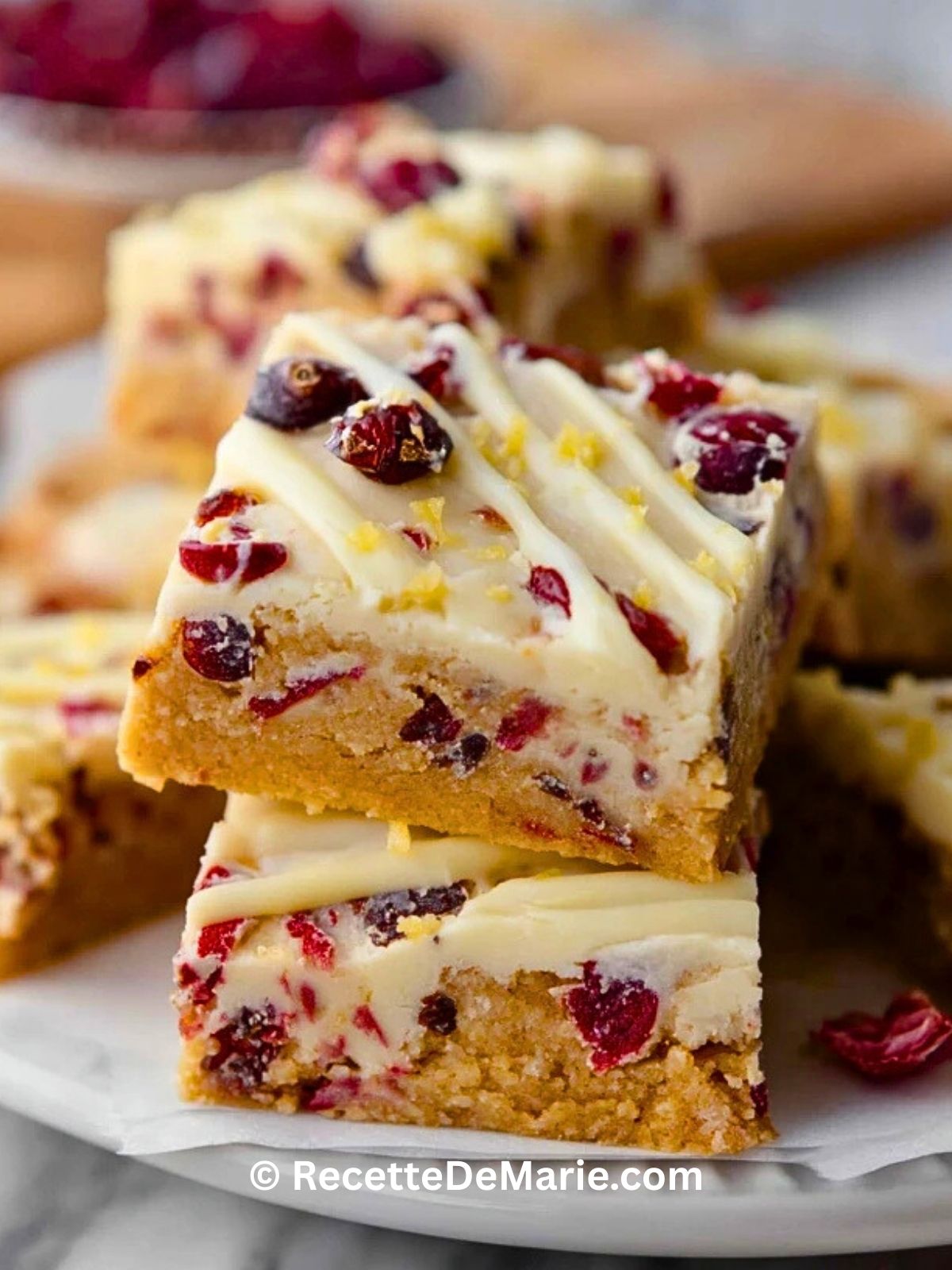Ne mélangez pas trop la pâte pour garder les barres ultra moelleuses. Utilisez les canneberges surgelées sans les décongeler pour éviter qu’elles ne détrempent la pâte. Vous pouvez ajouter du chocolat blanc ou des noix pour varier les saveurs.