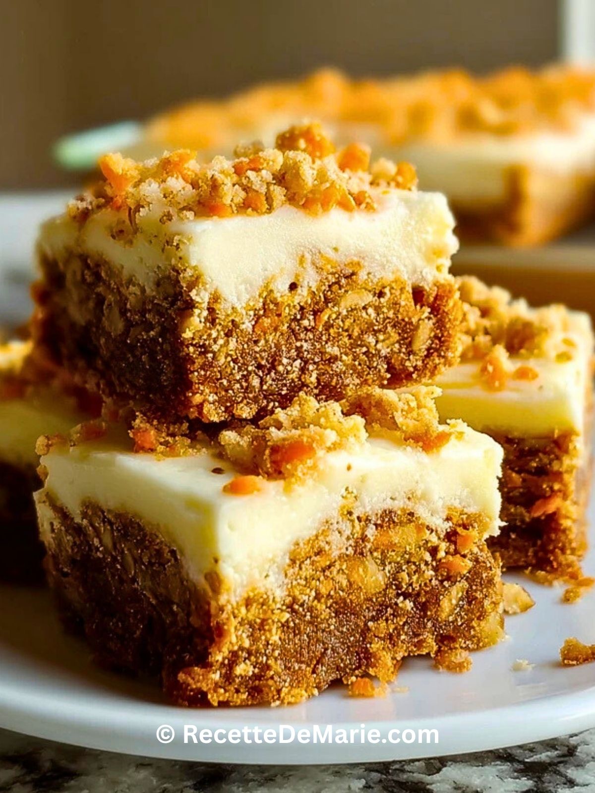 Ce que j’adore dans cette recette, c’est qu’elle allie la simplicité d’un gâteau familial avec l’originalité d’une présentation en barres. Parfaites pour un goûter, un brunch ou un pique-nique, ces barres font toujours leur petit effet. Et entre nous, difficile de résister à ce duo carotte-fromage à la crème !