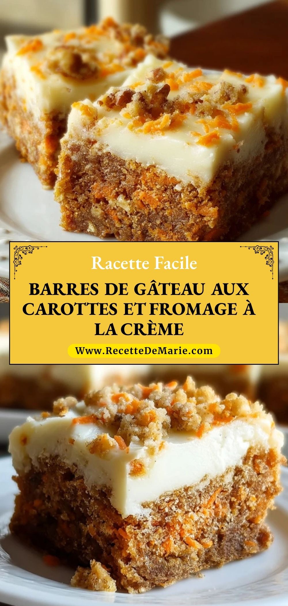 Ces barres de gâteau aux carottes sont moelleuses, parfumées aux épices, recouvertes d’un glaçage onctueux au fromage à la crème. Parfaites pour le goûter ou un brunch, elles se découpent facilement et se conservent très bien. Un dessert convivial à partager !