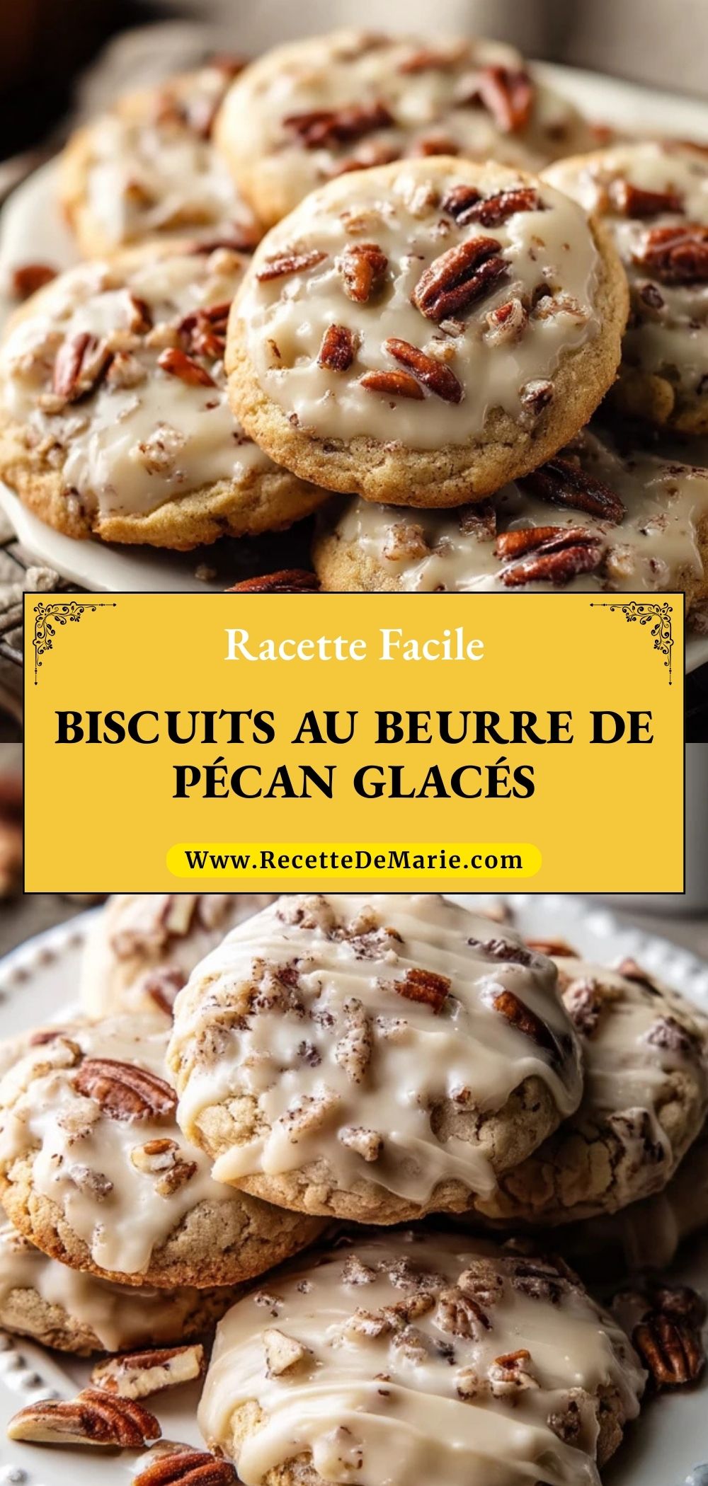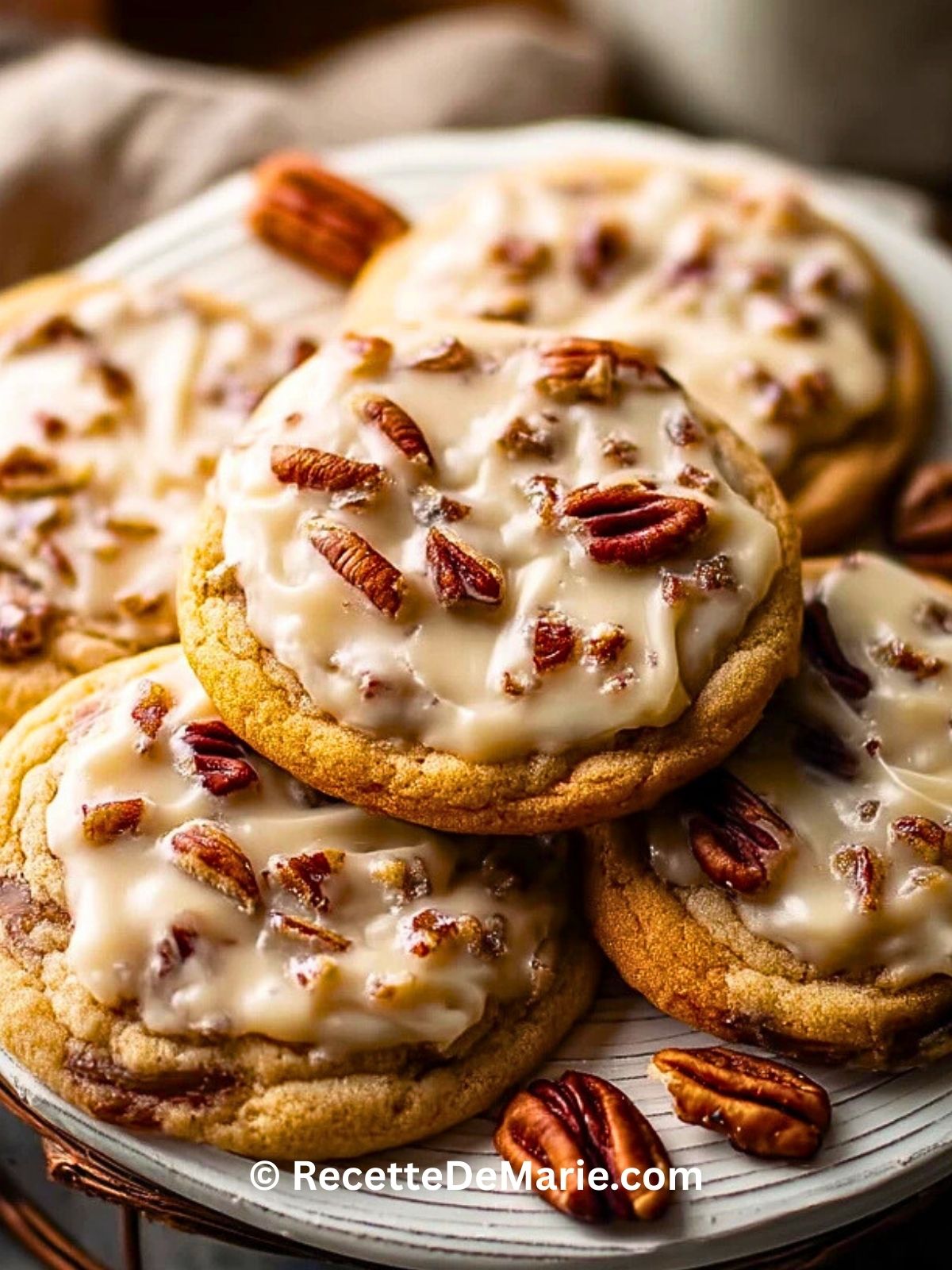 Biscuits au beurre de pécan glacés, moelleux au centre et légèrement croustillants sur les bords, garnis de noix de pécan grillées et d’un glaçage vanillé fondant. Une recette facile et rapide, parfaite pour les goûters gourmands, les fêtes de fin d’année ou les cadeaux faits maison à base de biscuits aux noix.