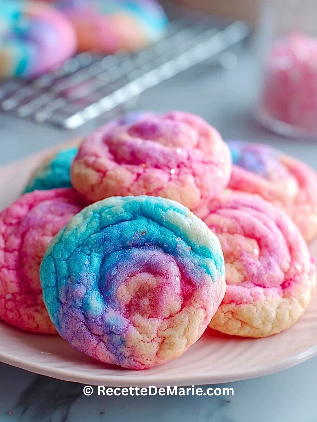 Ces biscuits nuageux en sucre filé sont de tendres cookies marbrés rose et bleu façon barbe à papa, au cœur moelleux et délicatement vanillé. Faciles à préparer avec des ingrédients du placard, ils sont parfaits pour les anniversaires, goûters festifs et buffets pastel, et apportent une touche féerique à chaque bouchée.