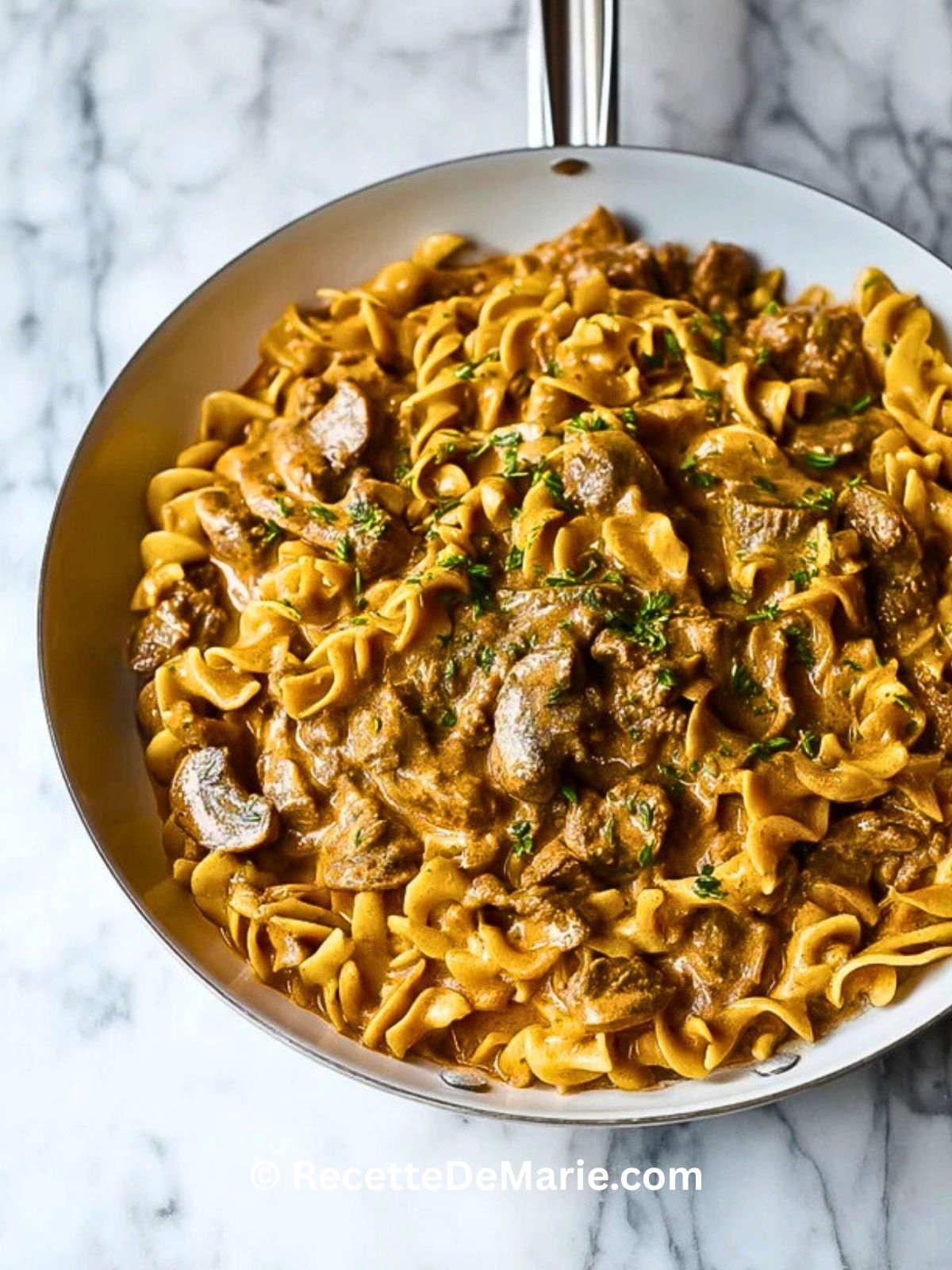 La première fois que je l’ai servi, la sauce était tellement onctueuse que tout le monde s’est resservi sans même se parler, juste avec des “hmm” de satisfaction autour de la table. Des morceaux de boeuf fondants, des champignons dorés, des pâtes qui cuisent directement dans le bouillon parfumé… et à la fin, une cuillerée de crème qui lie le tout. C’est le genre de recette que je garde toujours sous la main quand j’ai besoin d’un dîner qui fait plaisir à tout le monde.