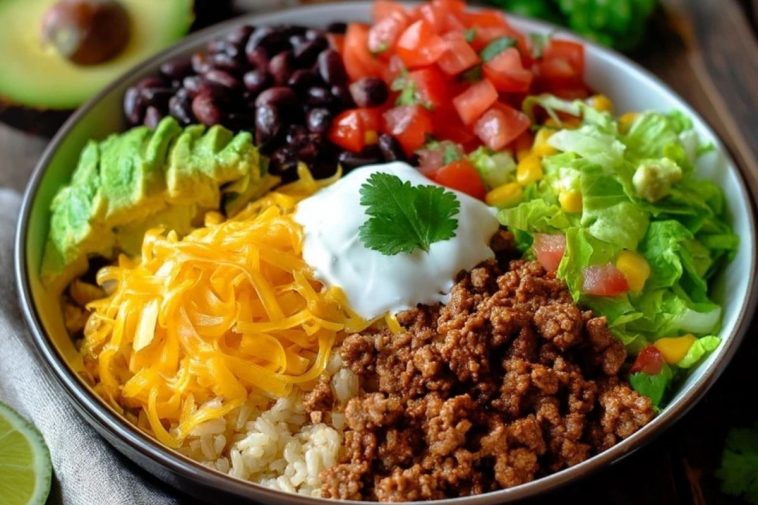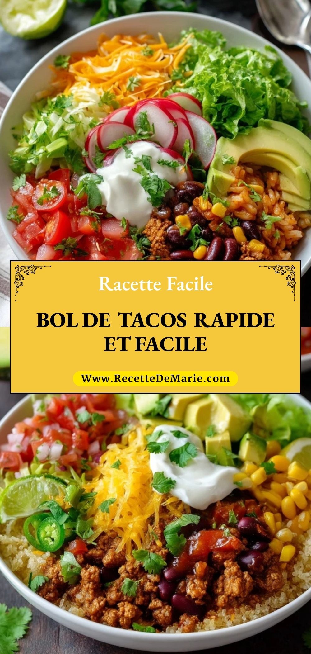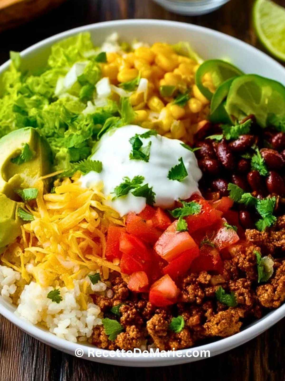 Un bol de tacos rapide et facile à préparer, parfait pour les soirs de semaine. Composé de riz, bœuf épicé, légumes frais et garnitures savoureuses, il est personnalisable et prêt en 20 minutes.