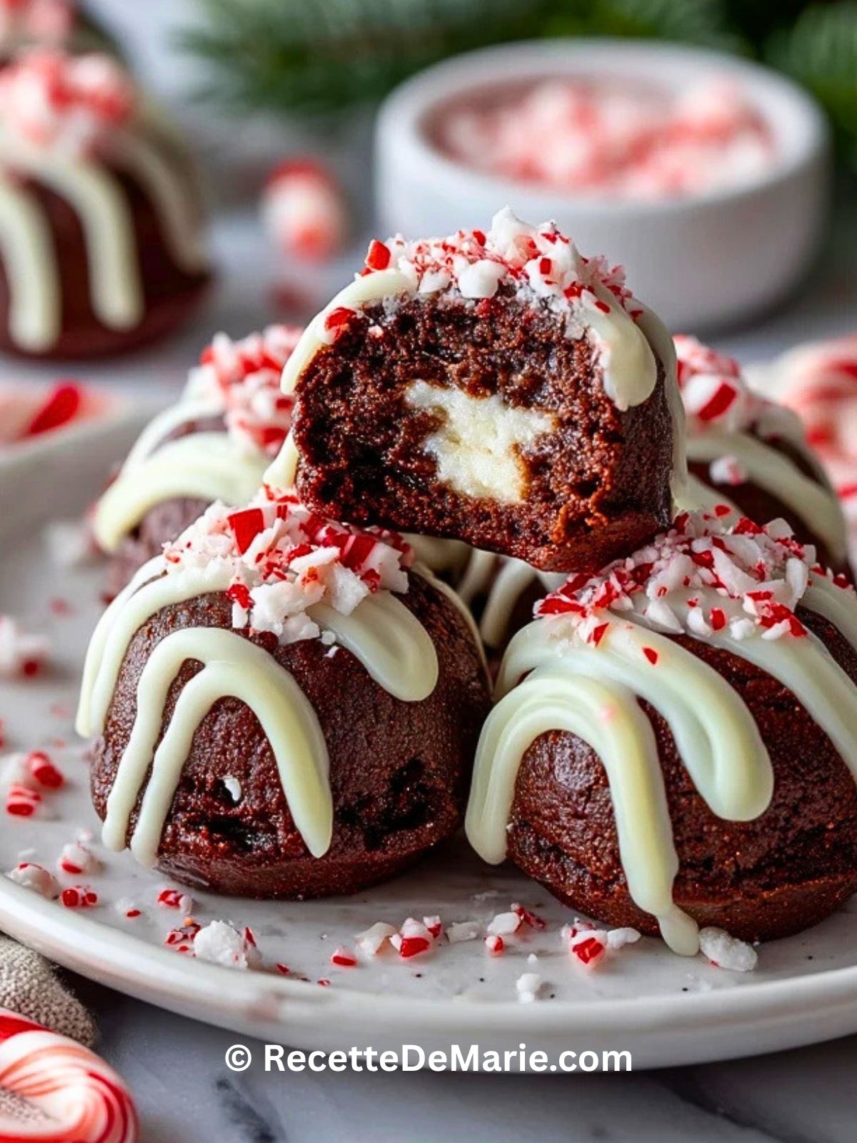 Faites fondre le chocolat blanc avec un peu d’huile de coco ou de crème, puis nappez les bombes refroidies. Parsemez aussitôt de bonbons à la menthe poivrée concassés pour qu’ils adhèrent bien avant que l’enrobage ne fige.