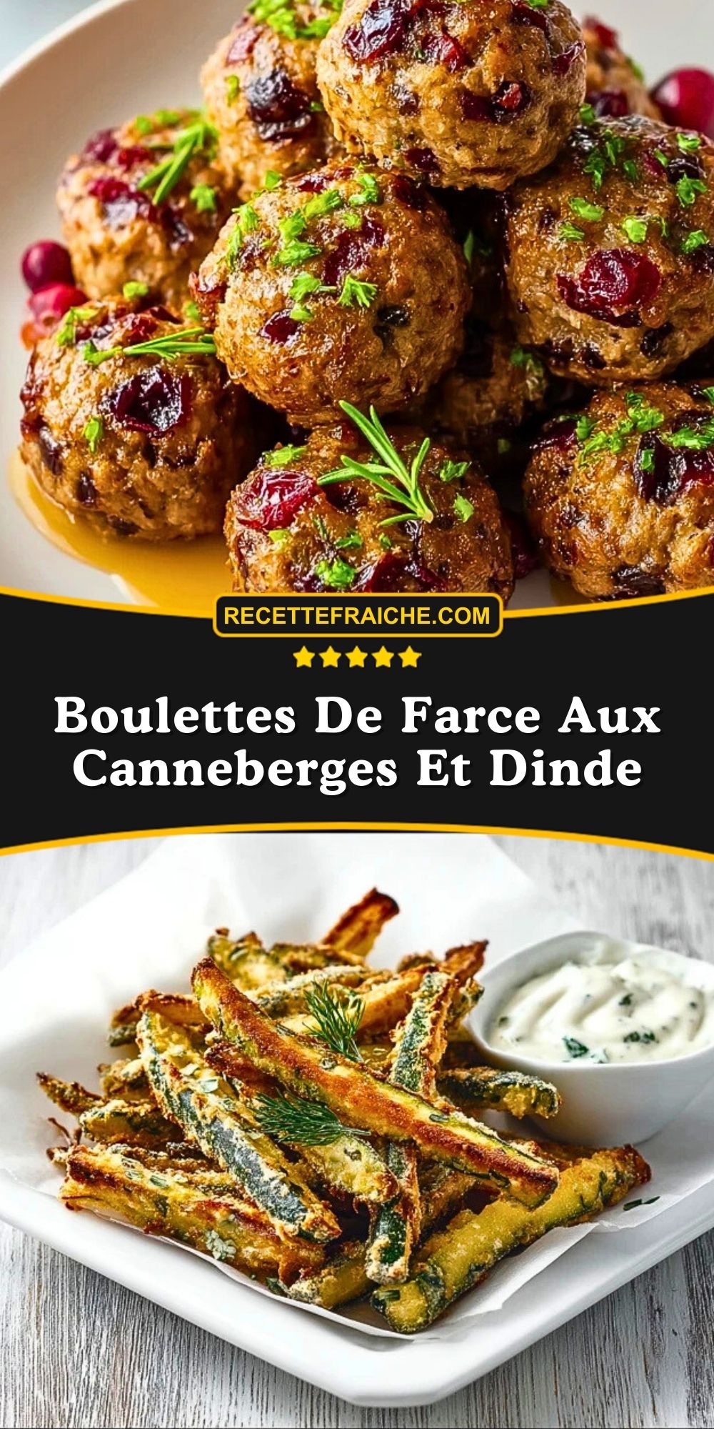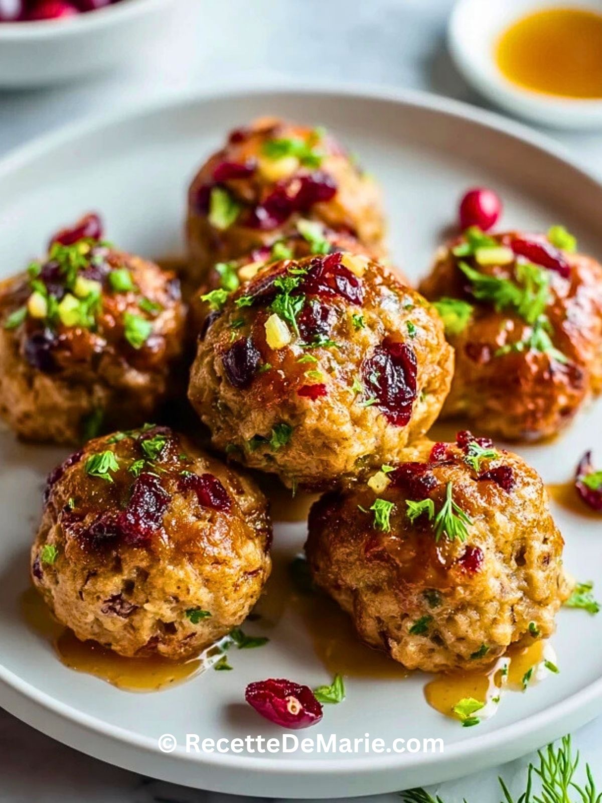 Ces boulettes de farce aux canneberges et dinde sont la solution parfaite pour réinventer la volaille en toute simplicité. Moelleuses, parfumées et colorées, elles réconcilient même les plus sceptiques avec la dinde ! Les canneberges apportent une touche d’originalité et de gourmandise qui fait toute la différence. Faciles à préparer, elles sont aussi parfaites pour un repas convivial ou un apéritif dinatoire. À essayer absolument si vous aimez les saveurs festives et les plats qui sortent de l’ordinaire !