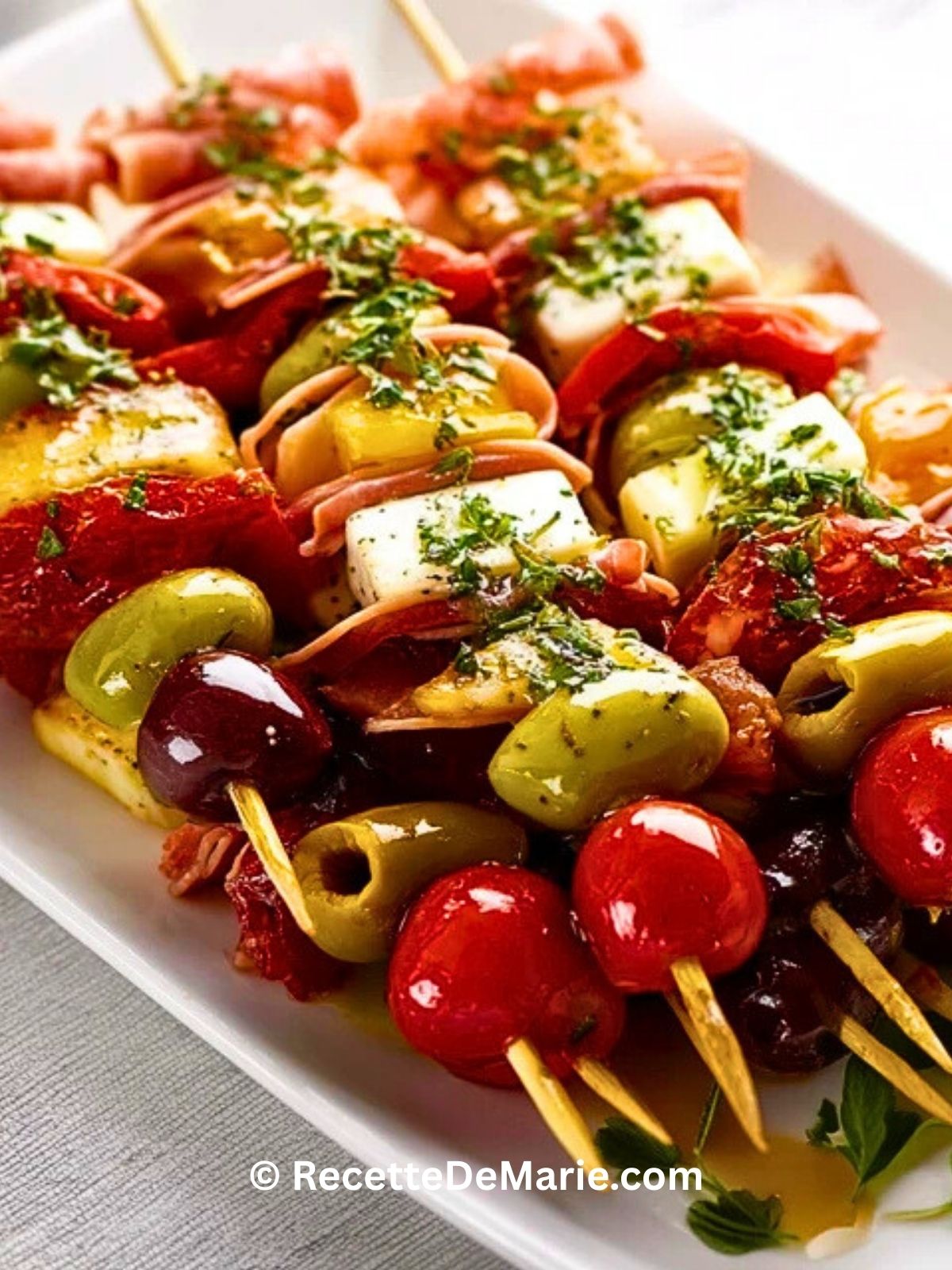 Les brochettes antipasto sont parfaites pour l’apéritif, les pique-niques ou les grandes tablées. Elles sont rapides à préparer, jolies à présenter, et réunissent tout le meilleur des saveurs méditerranéennes : mozza fondante, tomates juteuses, olives parfumées, charcuteries fines, le tout relevé d’herbes et d’un filet d’huile d’olive.