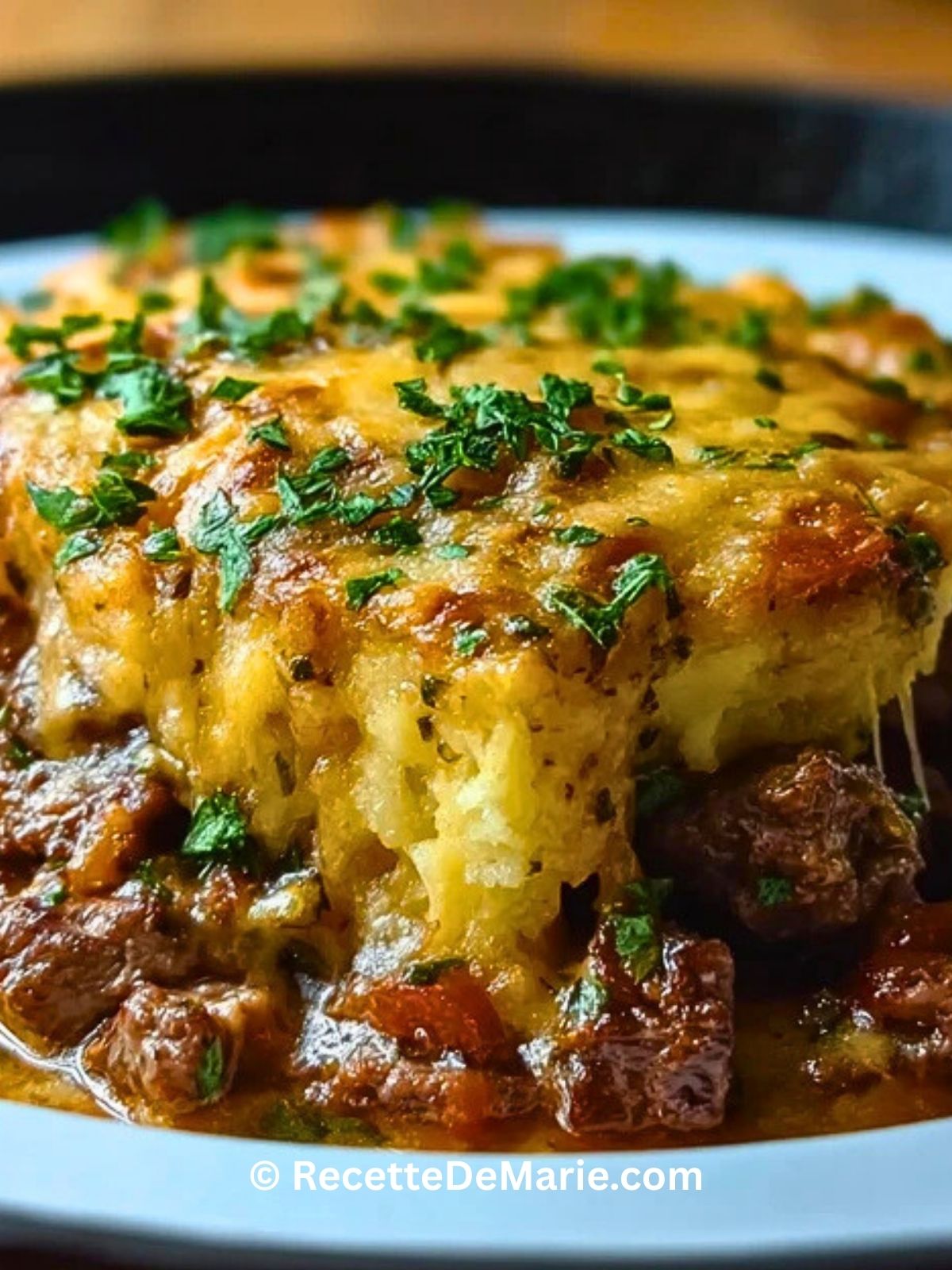 Un plat complet et convivial, parfait pour les grandes tablées ou les repas du dimanche. La viande de bœuf mijote lentement avec des légumes, des épices et une sauce onctueuse, avant d’être recouverte de fromage fondant et de tomates. Résultat : un mélange de textures et de saveurs qui fait voyager, avec une touche réconfortante et gourmande !