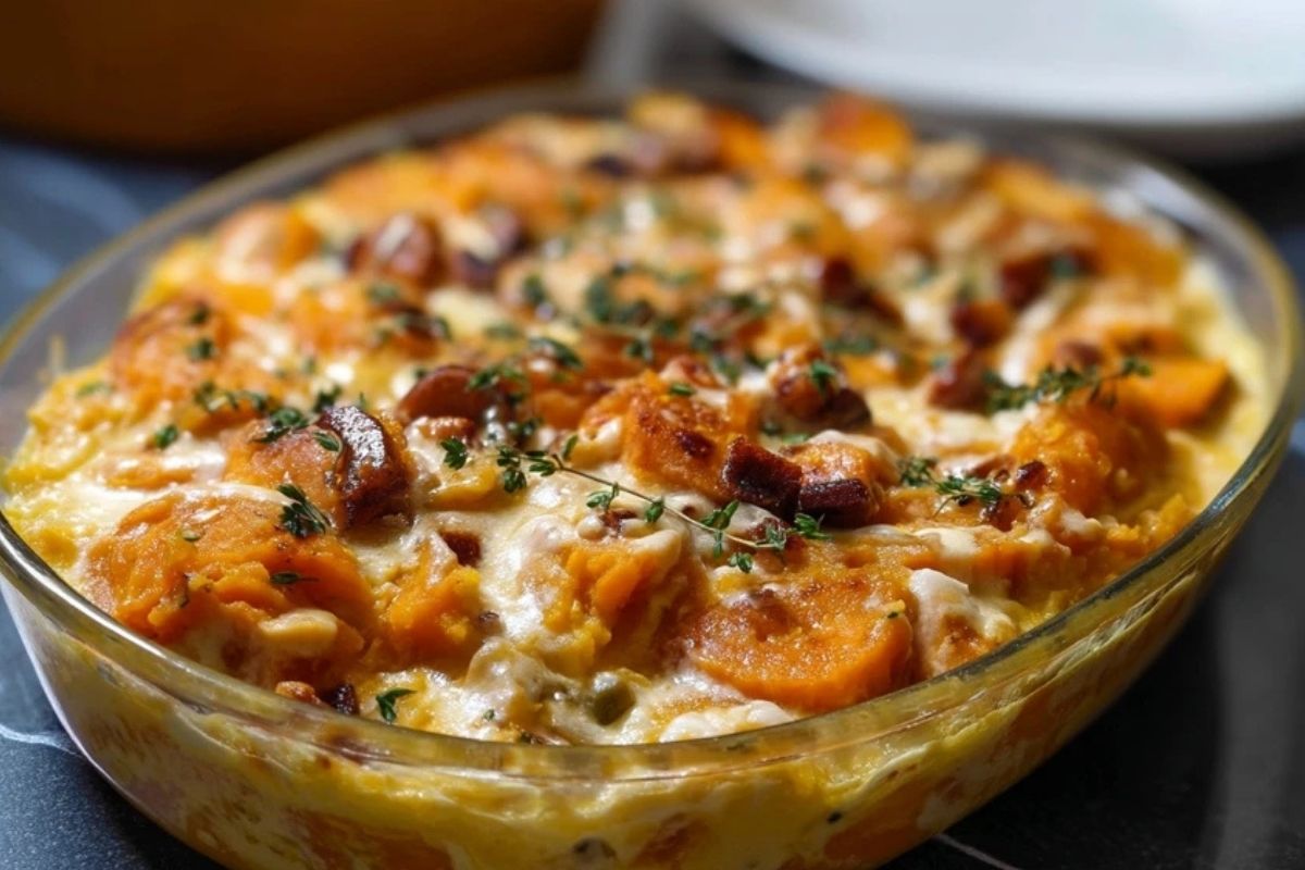 J’ai découvert cette version “riche” en y ajoutant une touche de crème, un peu de fromage et quelques lardons dorés pour la gourmandise. Le résultat ? Un plat ultra crémeux, encore plus savoureux, qui disparaît à une vitesse folle. J’aime la préparer à l’avance et la réchauffer, elle n’en est que meilleure… et c’est le genre de recette qui transforme des patates douces toutes simples en un vrai plat de fête !