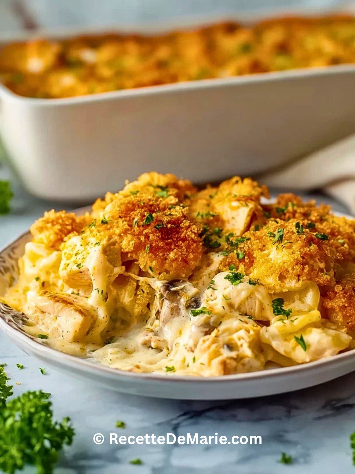 Autre point important : ne faites pas gratiner trop longtemps. Une cuisson excessive peut dessécher le poulet et rendre la garniture moins crémeuse. Il vaut mieux surveiller les dernières minutes pour obtenir juste ce qu’il faut de coloration.