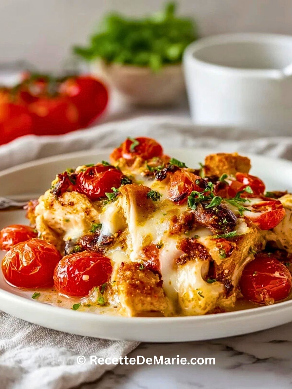 Cette recette combine des ingrédients simples avec un rendu très appétissant. Le poulet reste moelleux, les tomates apportent une belle fraîcheur, et le fromage gratiné crée une couche fondante qui rend chaque bouchée encore plus satisfaisante. L’ail, le basilic et l’assaisonnement italien donnent au plat un parfum ensoleillé très agréable.