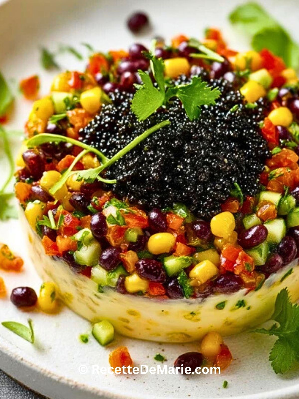 Ce caviar texan végétarien est ultra simple, mais vraiment savoureux. Il regorge de fibres, de protéines, et d’antioxydants. C’est le plat parfait à partager lors d’un buffet ou d’un apéro dinatoire, facile à personnaliser avec vos ingrédients préférés. Sa vinaigrette citronnée et légèrement relevée le rend absolument irrésistible. Succès garanti !