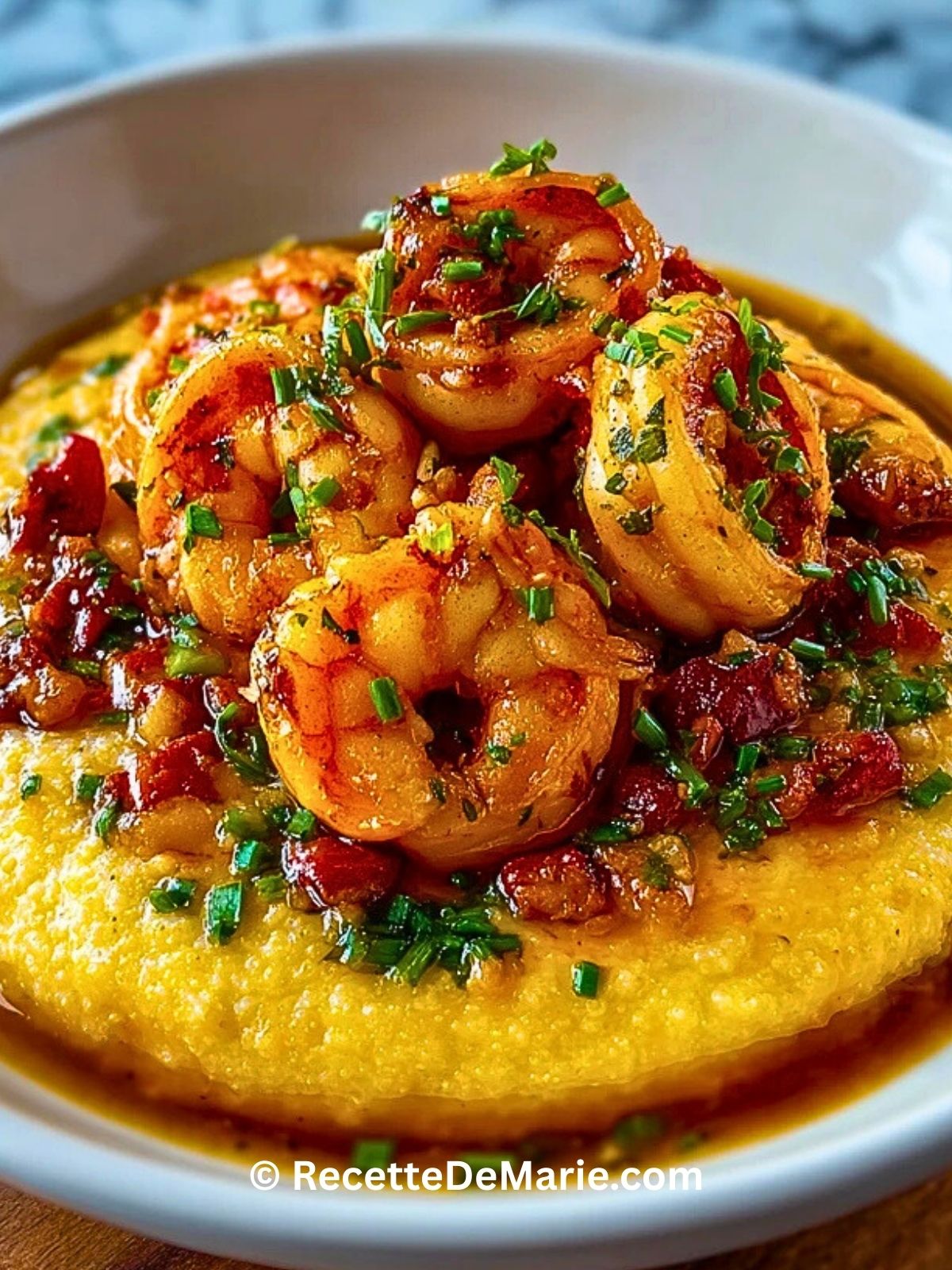 Je me souviens encore de la première fois où j’ai servi ces crevettes sur un lit de polenta crémeuse : tout le monde s’est arrêté de parler à la première bouchée. La texture fondante de la polenta, le côté légèrement fumé du bacon et les crevettes bien juteuses parfumées à l’ail et au citron… c’est exactement le genre de plat qui donne l’impression de dîner au restaurant, sans quitter sa cuisine.