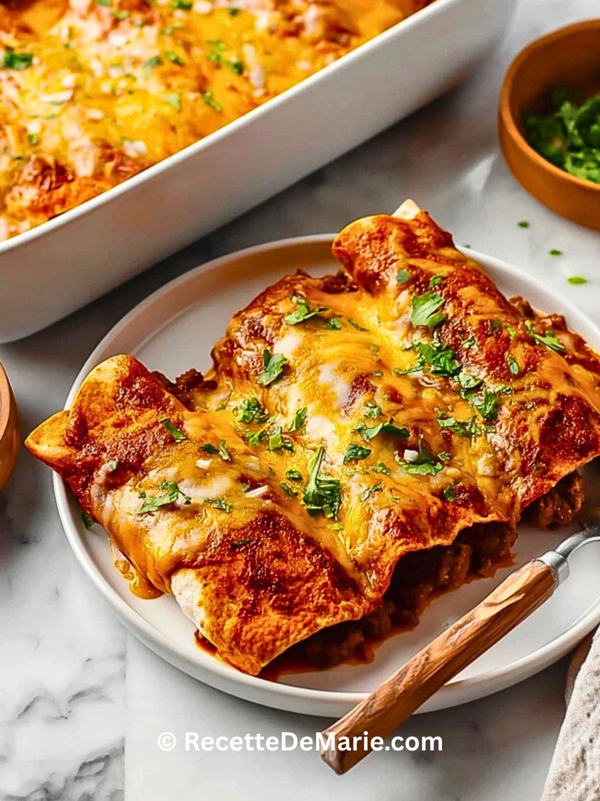 Je pourrais vivre de plats gratinés au fromage, et ces enchiladas de bœuf à la sauce rouge sont clairement en tête de liste. Des tortillas bien garnies d’une farce parfumée au bœuf, roulées, nappées de sauce rouge légèrement épicée, puis recouvertes d’une généreuse couche de fromage fondant… rien qu’en y pensant, j’ai envie de ressortir mon plat à gratin.