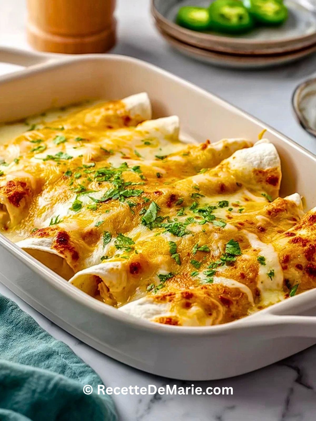 Ces enchiladas ont tout pour devenir un classique à la maison. La garniture au poulet reste tendre, la sauce apporte du crémeux, et le fromage gratiné forme une belle couche dorée sur le dessus. Chaque bouchée est riche, douce et parfumée.