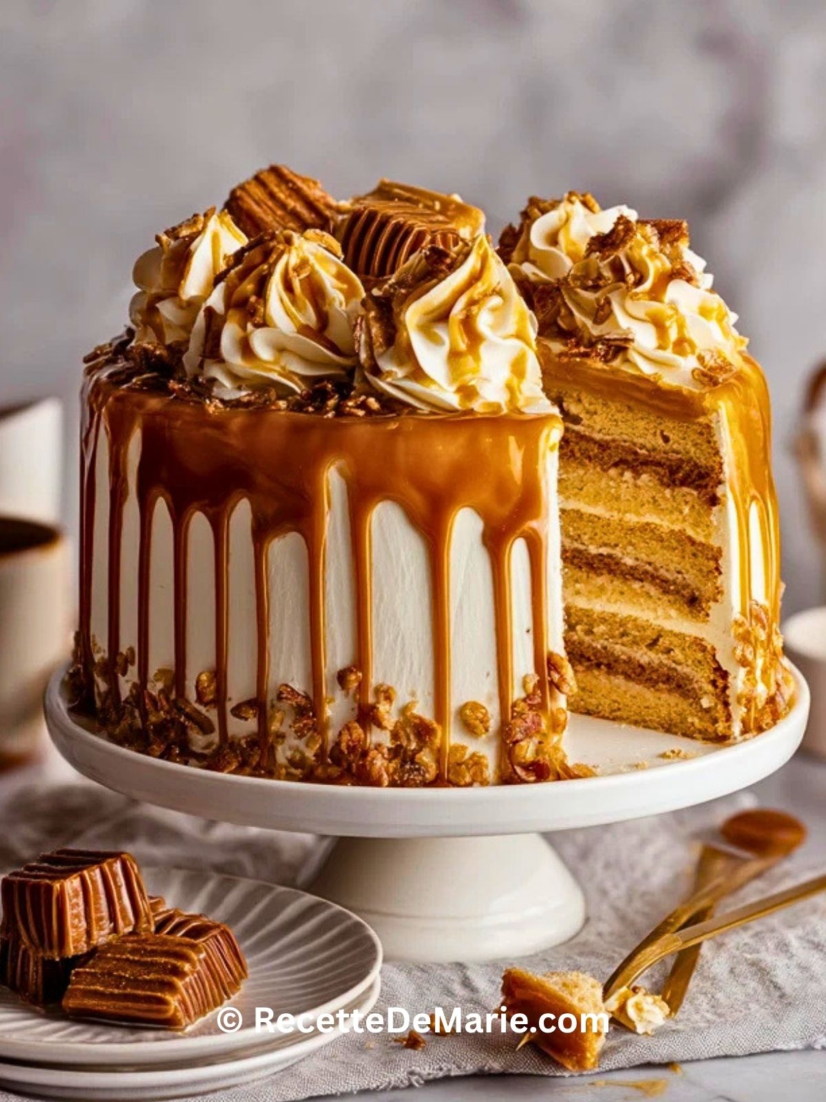 Ce gâteau réunit tout ce qu’on attend d’un grand dessert maison : une mie tendre, une saveur riche en caramel, une garniture onctueuse et une présentation spectaculaire. Le caramel apporte une profondeur gourmande sans rendre le gâteau écœurant, tandis que la crème légère sur le dessus équilibre l’ensemble. C’est aussi une recette parfaite à personnaliser avec un peu de fleur de sel, des éclats de chocolat ou quelques morceaux de bonbons au caramel.