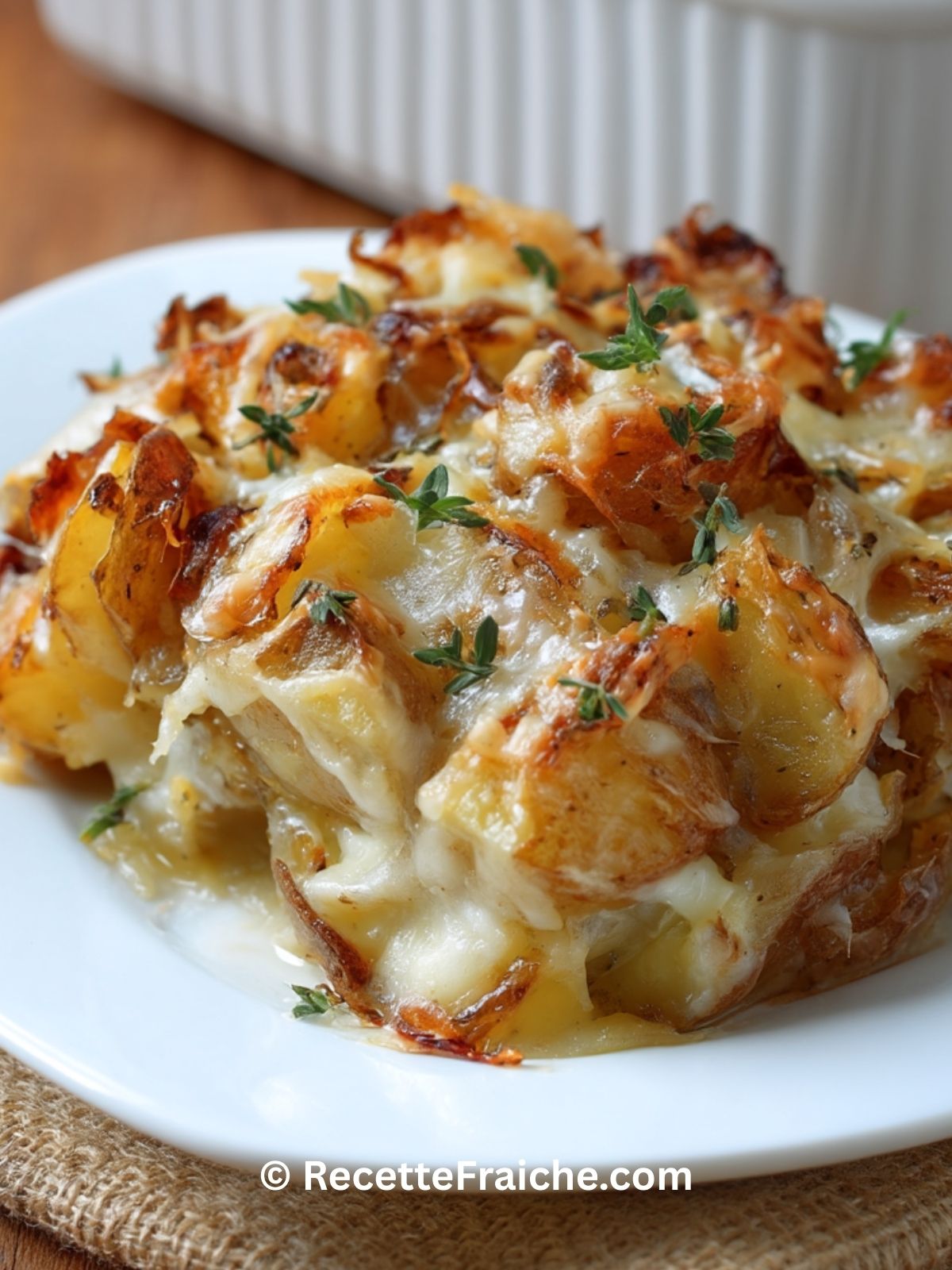 Ce gratin de pommes de terre à l’oignon français est un plat familial, fondant, avec des oignons caramélisés, une touche de crème et de fromage. Parfait pour les repas conviviaux, il accompagne viandes ou se déguste seul avec une salade.