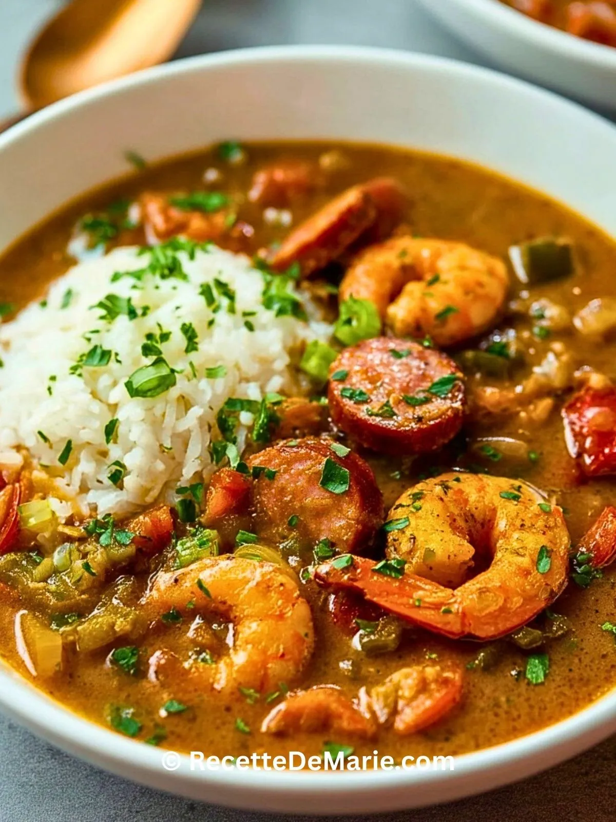 Un Gumbo Cajun authentique, savoureux et parfumé, composé de crevettes, de saucisse andouille fumée et d’épices cajun, mijoté avec des légumes et servi avec du riz blanc. Parfait pour partager la convivialité louisianaise à table.