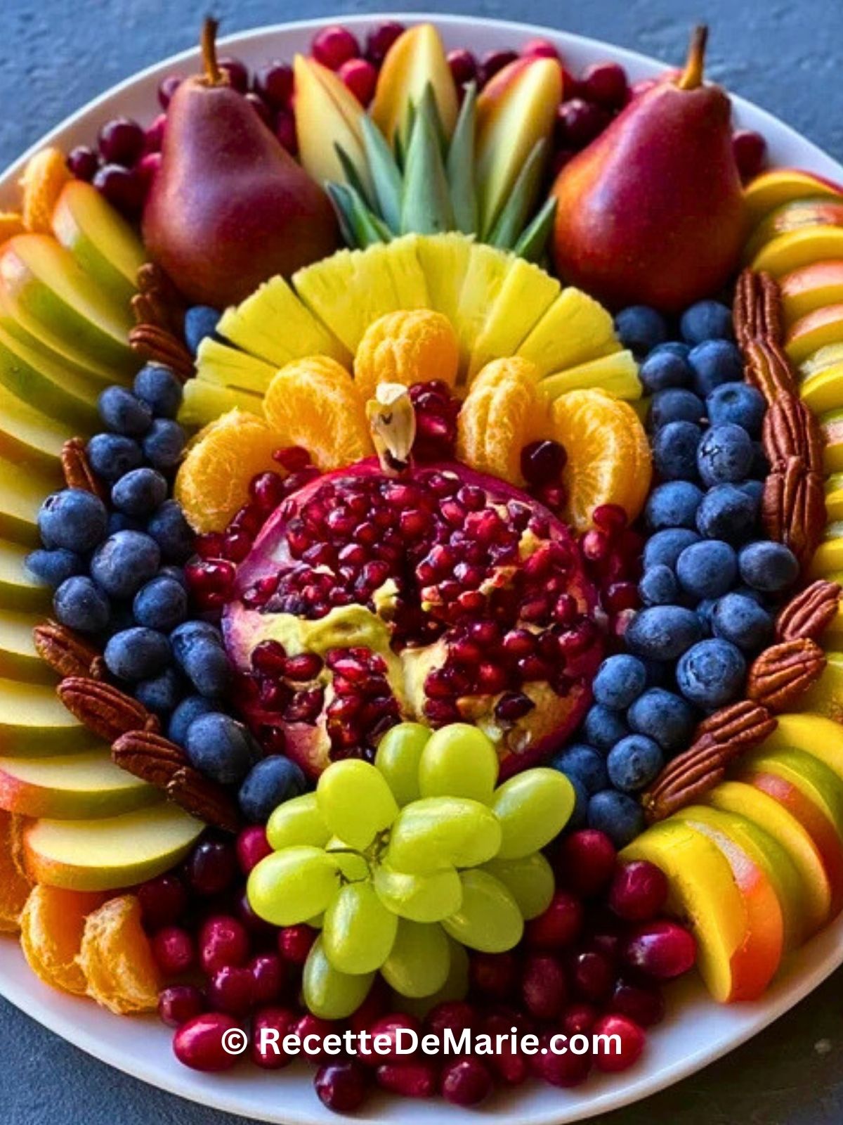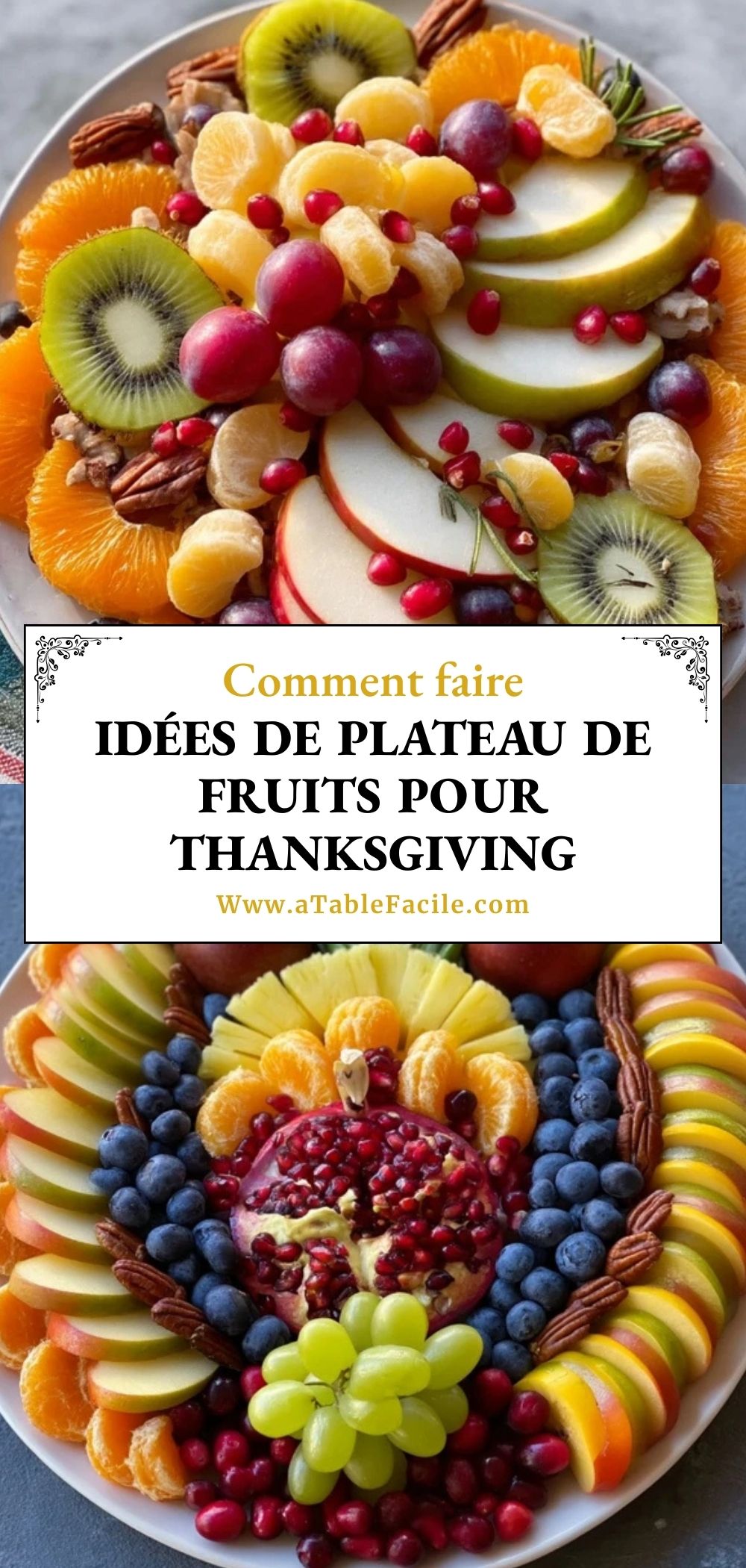 Un plateau de fruits frais et colorés parfait pour Thanksgiving, facile à réaliser, sans cuisson, sain et élégant. Idéal pour sublimer vos repas de fête avec des agrumes, pommes, kiwis, baies et raisins. Fraîcheur et gourmandise garanties !