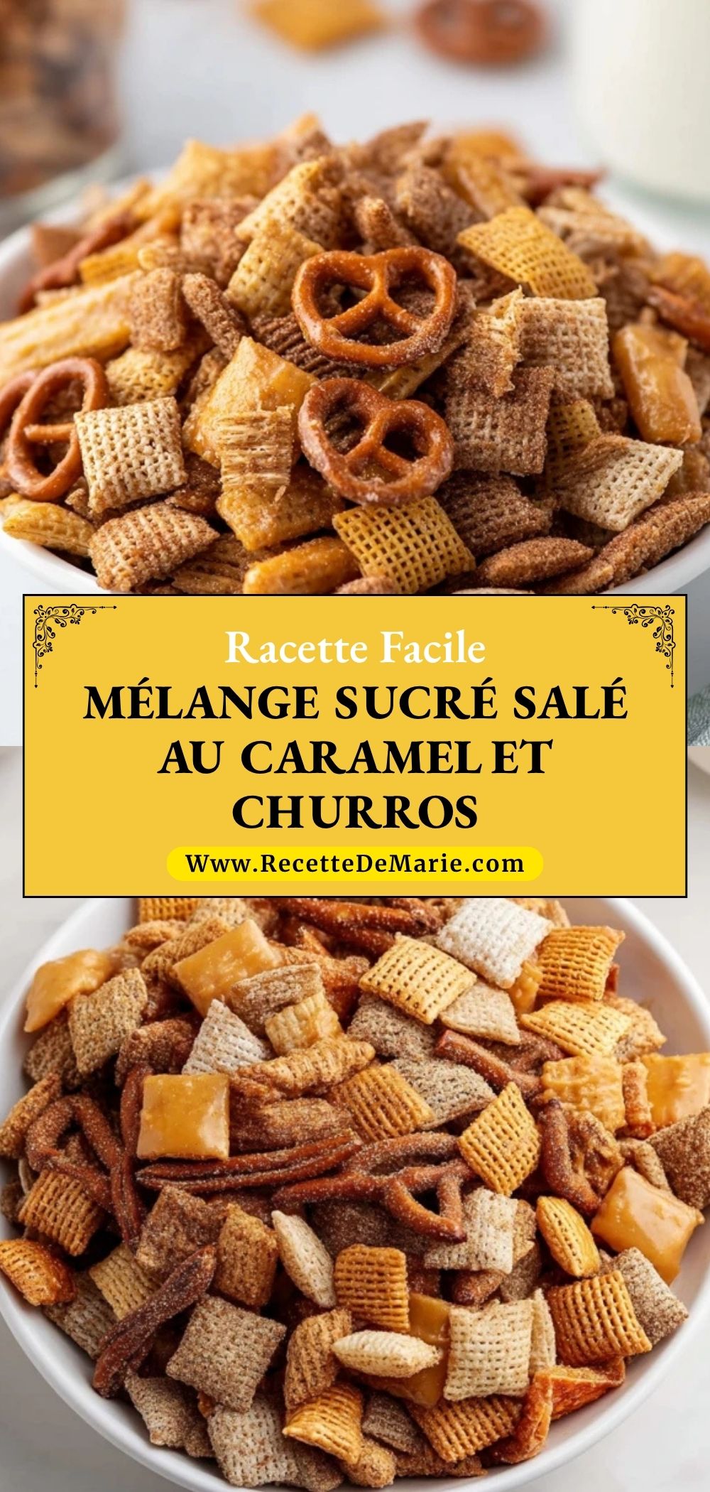 Keywords: mélange sucré salé au caramel et churros, snack croustillant, céréales caramel, bretzels sucrés salés, recette apéritif sucré