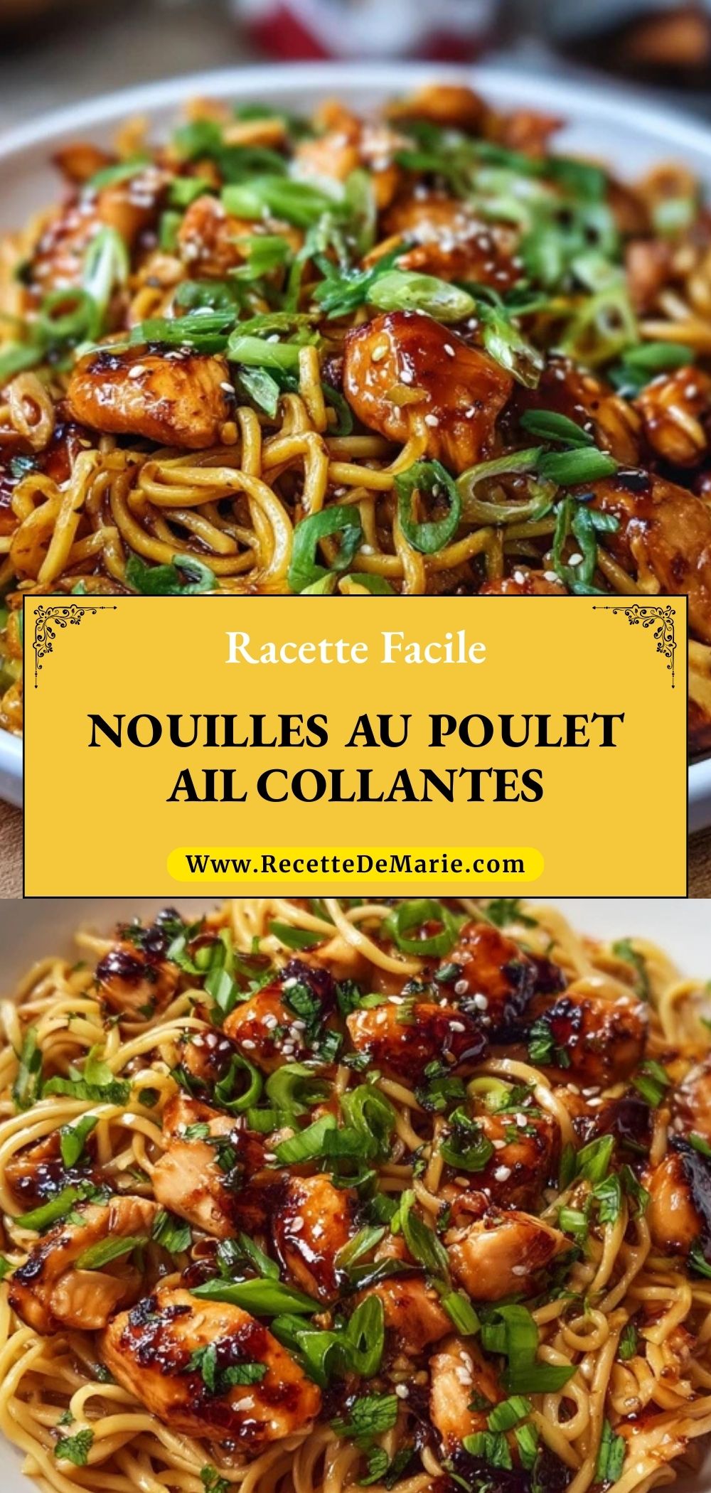 Dès que j’ai envie d’un plat rapide et savoureux qui fait voyager mes papilles, je prépare ces Nouilles Au Poulet Ail Collantes. C’est un vrai régal aux saveurs asiatiques, avec des morceaux de poulet tendres, une sauce collante à l’ail et des nouilles parfaitement enrobées. J’aime ce plat pour sa générosité, sa simplicité et la façon dont il plaît à toute la famille, même aux plus difficiles !