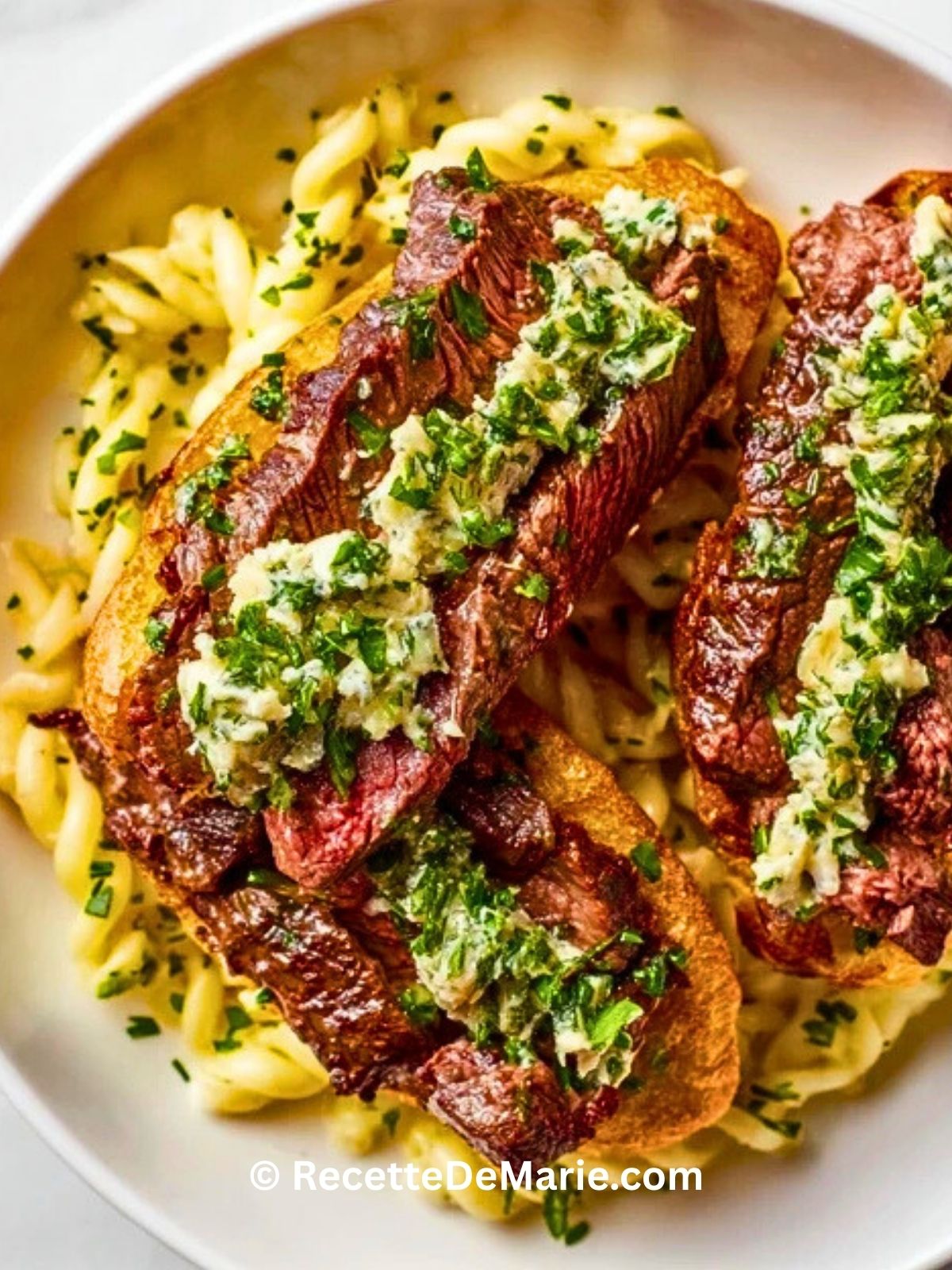 Pour un steak encore plus tendre, choisissez une pièce de viande de qualité et ne négligez pas le temps de repos après cuisson. Si vous aimez le beurre bien parfumé, n’hésitez pas à ajouter un peu de zeste de citron ou de ciboulette. Pour plus d’onctuosité, vous pouvez ajouter une cuillère de crème fraîche dans les nouilles juste avant de servir.
