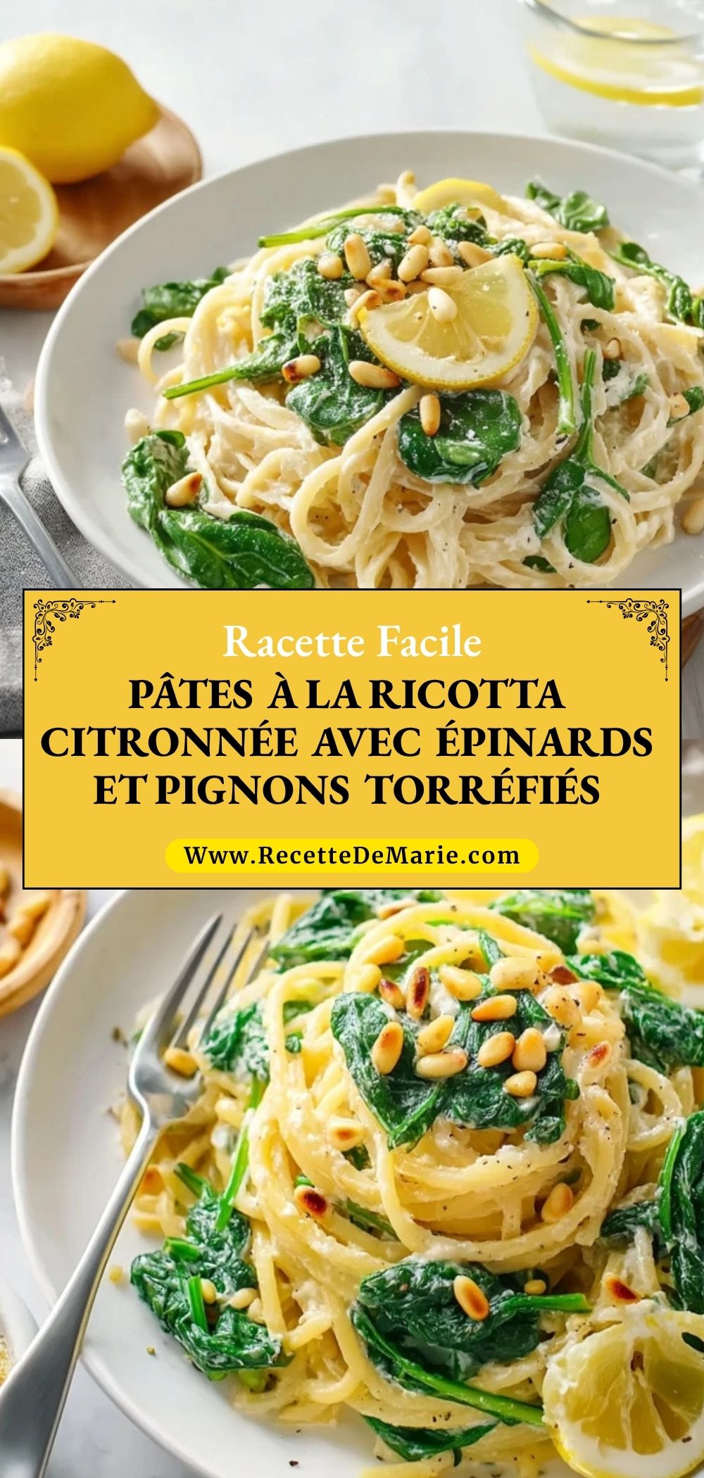 Keywords: pâtes à la ricotta citronnée, pâtes aux épinards, pâtes végétariennes crémeuses, recette de pâtes au citron, pâtes aux pignons