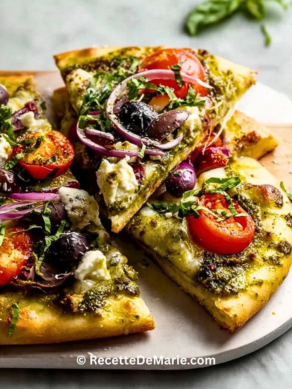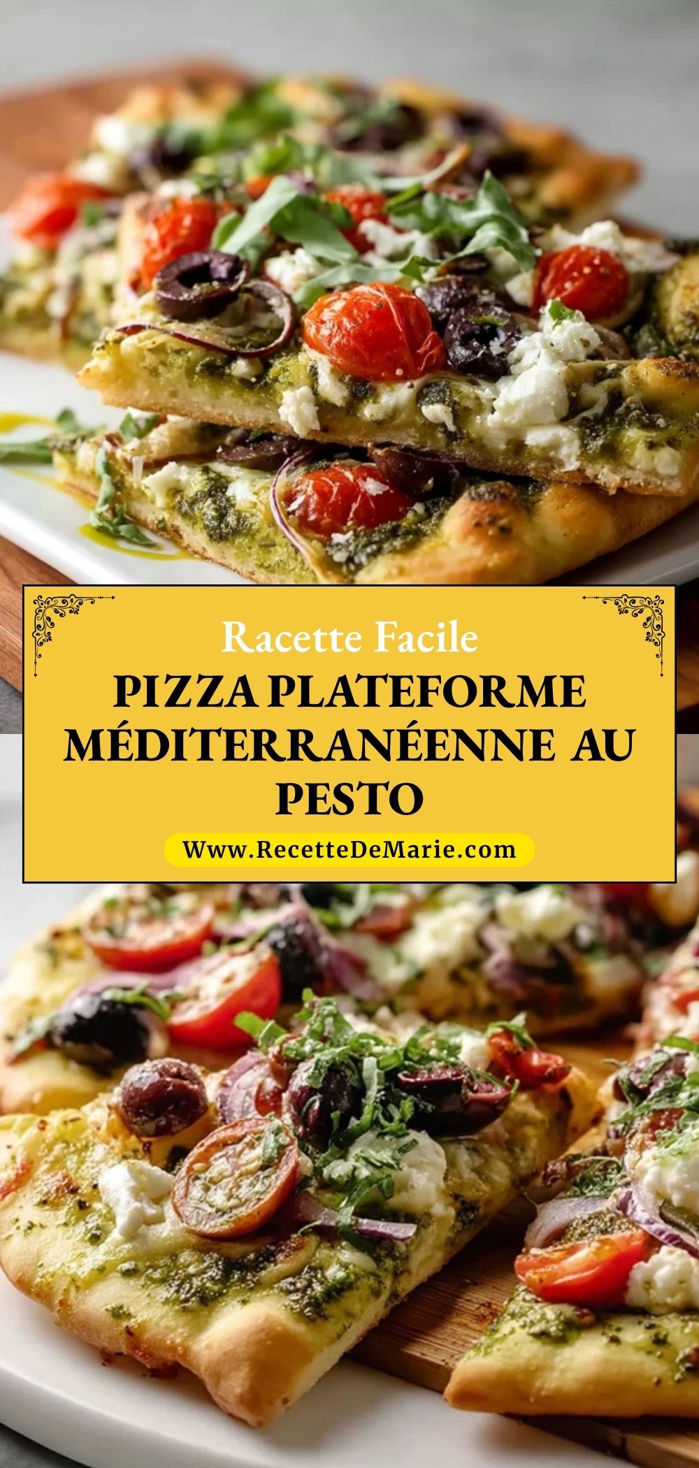 Keywords: pizza méditerranéenne au pesto, pizza au pesto, pizza feta olives, pizza maison facile, recette pizza méditerranéenne