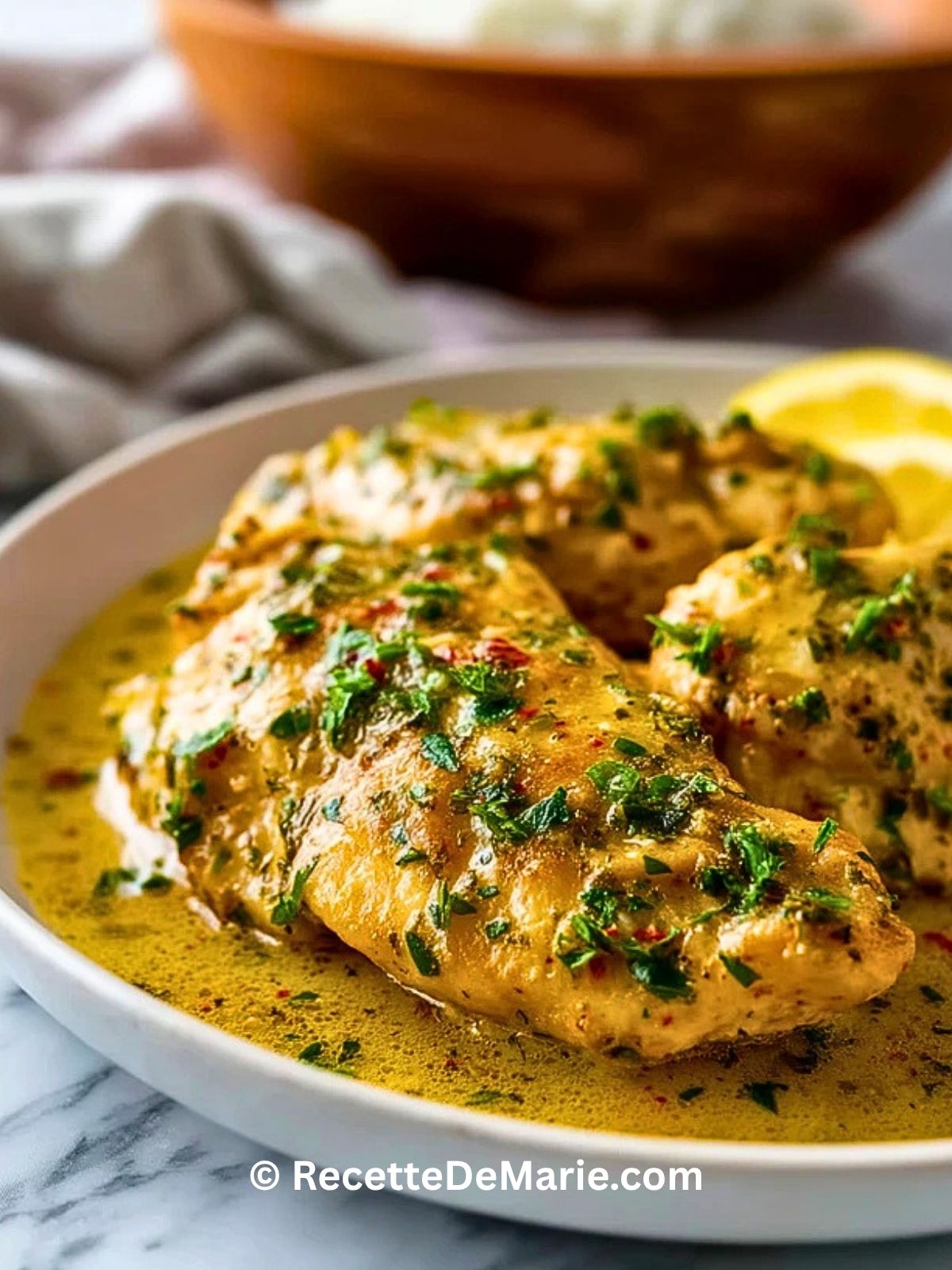 Le Poulet Au Beurre À L’Ail est une recette facile et rapide, idéale pour un dîner gourmand en semaine. Ce blanc de poulet poêlé est nappé d’une sauce crémeuse au beurre, à l’ail, au citron et aux herbes fraîches. Parfait avec du riz, des pâtes ou des légumes, ce plat familial offre un poulet tendre, parfumé et riche en saveurs, avec une cuisson simple et un résultat irrésistible.