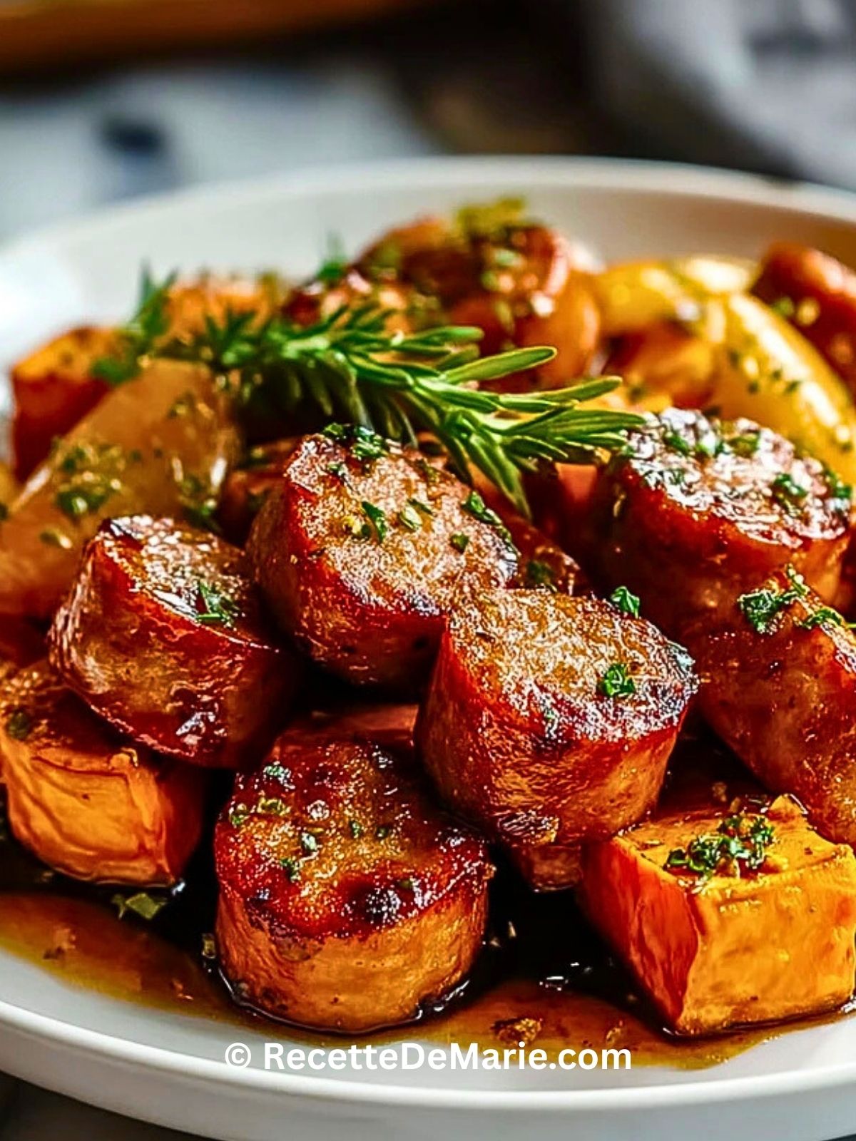 Ce que j’adore dans cette recette, c’est le contraste entre le côté fondant des patates rôties et la texture juteuse des saucisses. À chaque bouchée, on retrouve un équilibre parfait entre sucré et salé, idéal pour un repas convivial sans complication.