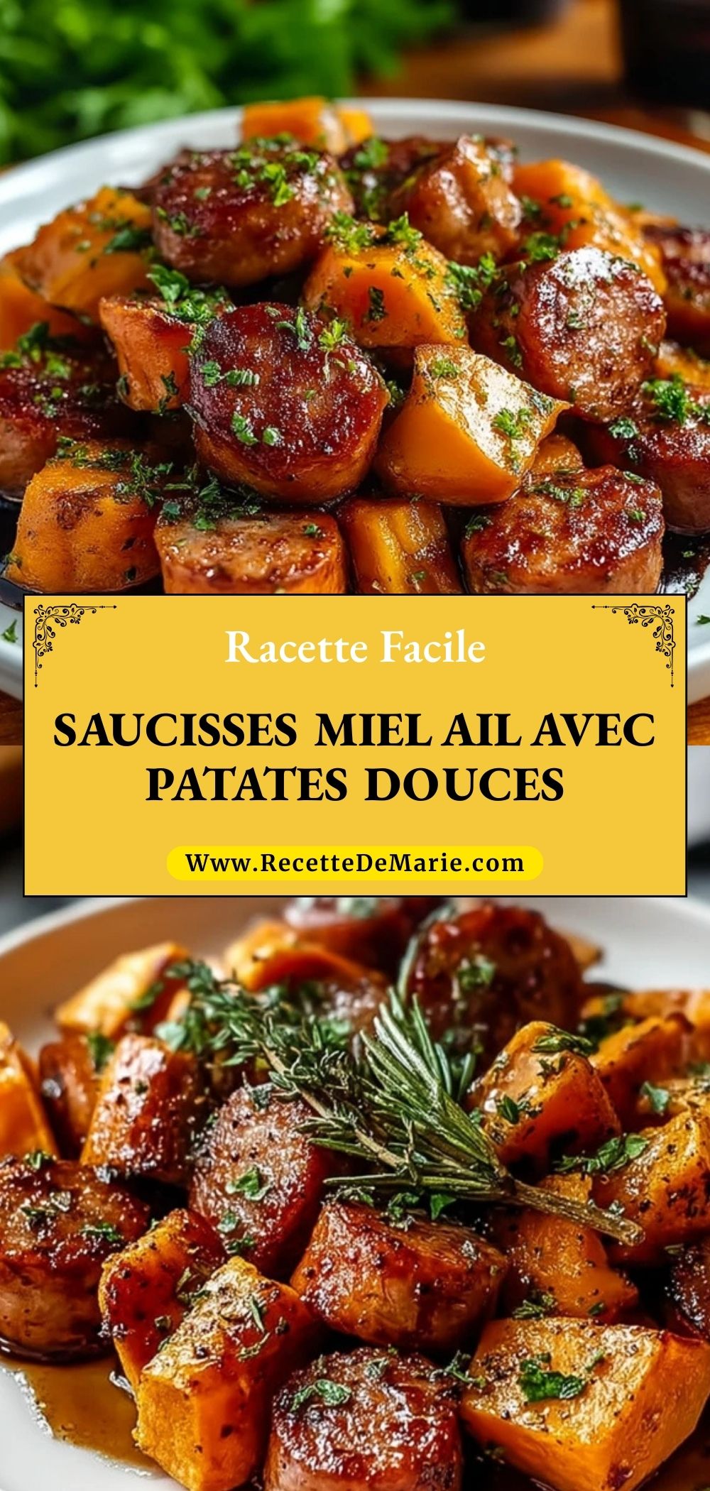 Keywords: saucisses miel ail, patates douces rôties, recette sucré salé, dîner facile