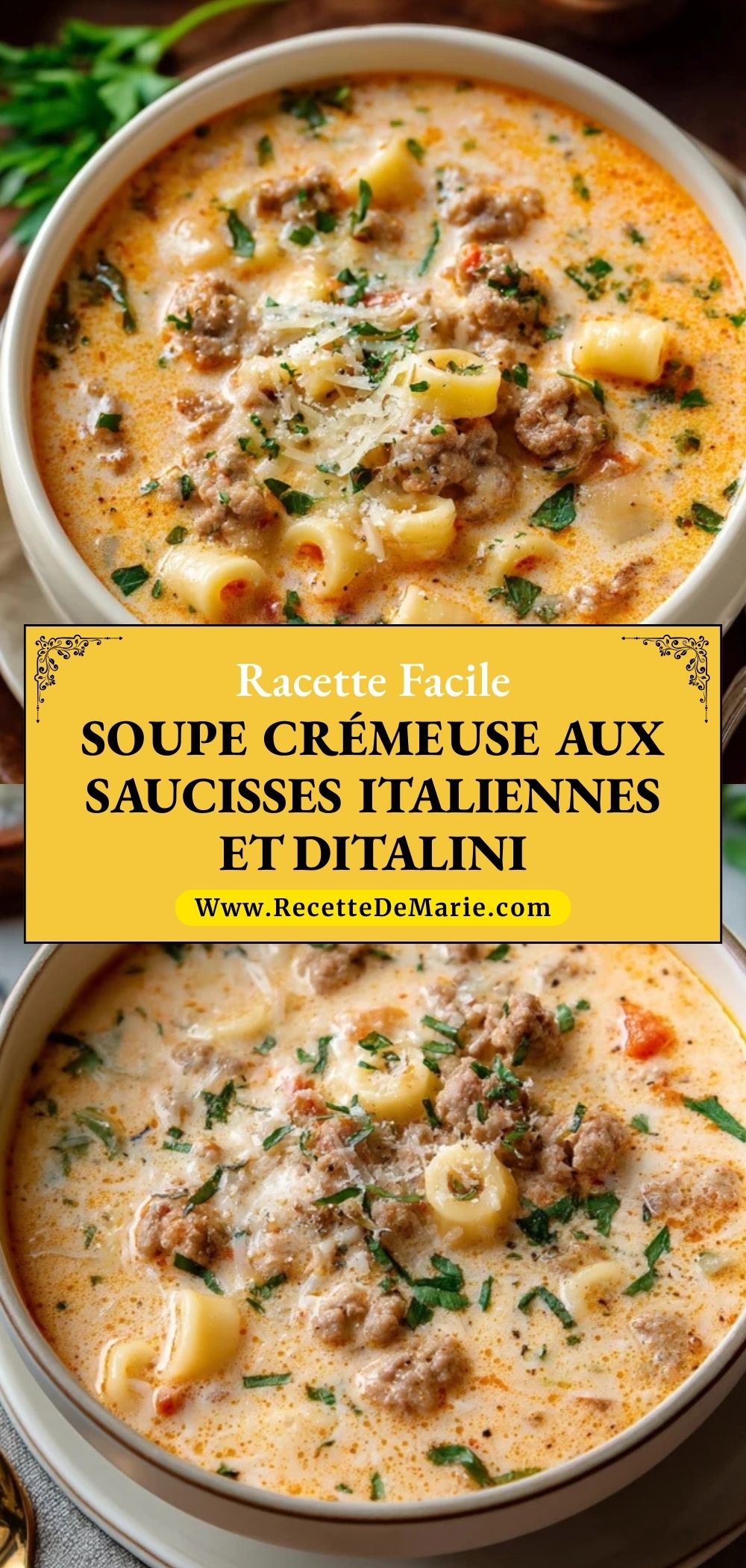 Keywords: soupe crémeuse saucisses italiennes, soupe ditalini, soupe italienne facile, soupe repas complète