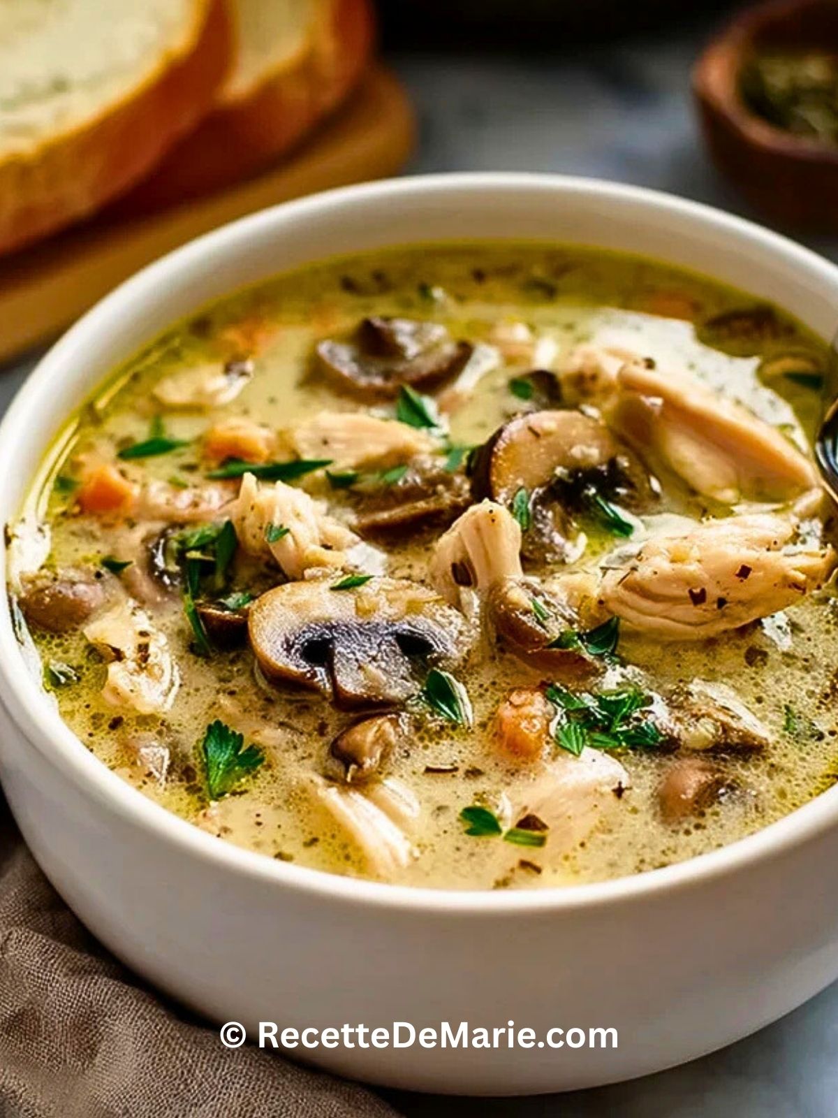 Une soupe réconfortante et savoureuse à base de poulet rôti et champignons fondants. Parfaite pour utiliser des restes, cette recette facile offre un bouillon parfumé, légèrement crémeux et riche en protéines. Idéale pour un dîner léger ou une entrée chaleureuse en saison froide.